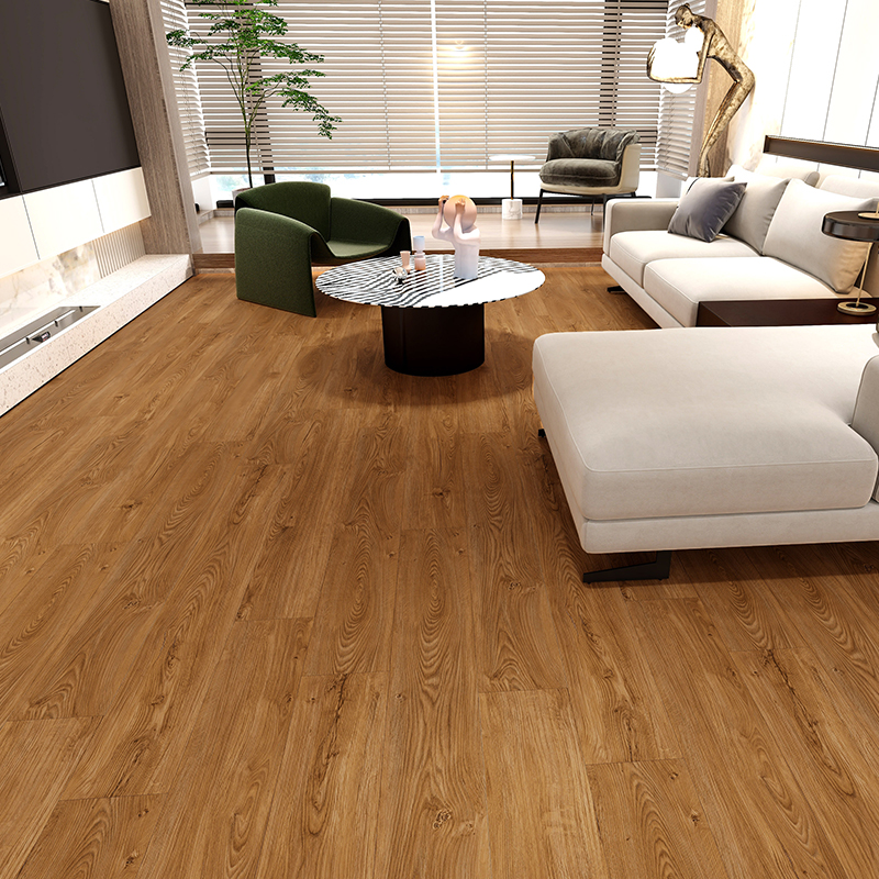 El piso de tablones de vinilo con patrón de madera de roble marrón cálido SPC Click presenta un tono suave y discreto que resalta las capas naturales de veta de roble. Con un nivel de brillo de 5–10, la superficie presenta un aspecto casi mate, ofreciendo un aspecto cálido y refinado que realza la comodidad y elegancia de cualquier interior.